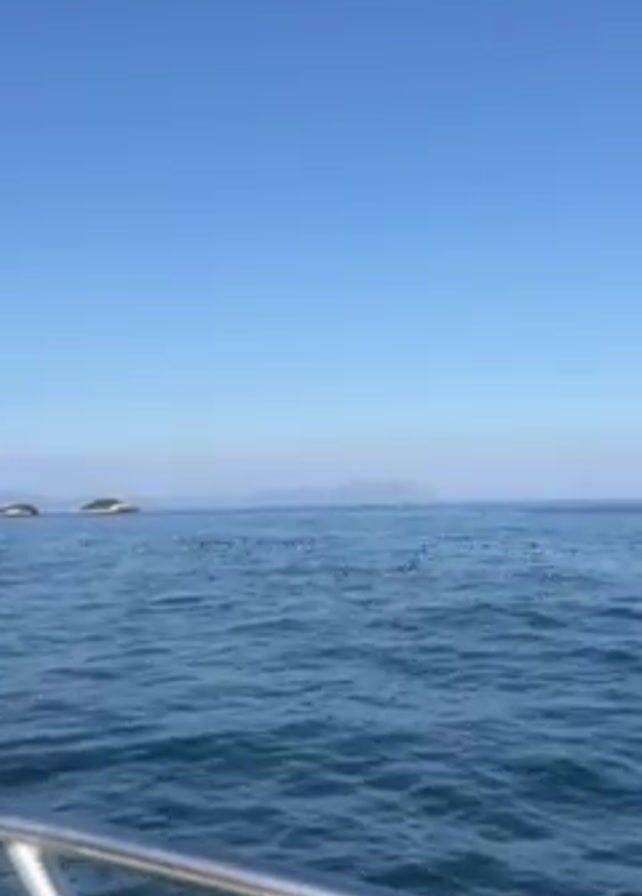 view from a boat on the open ocean. The boat is moving, and the camera is steady. The water is a deep blue and there are gentle waves. In the distance are some rocky land formations, and further off, some faint mountains. A large flock of birds is visible, spread out over the water. Some of the birds are in the air while many are on the surface of the water. The sky is clear and bright blue. Part of the boat's railing is visible in the foreground.