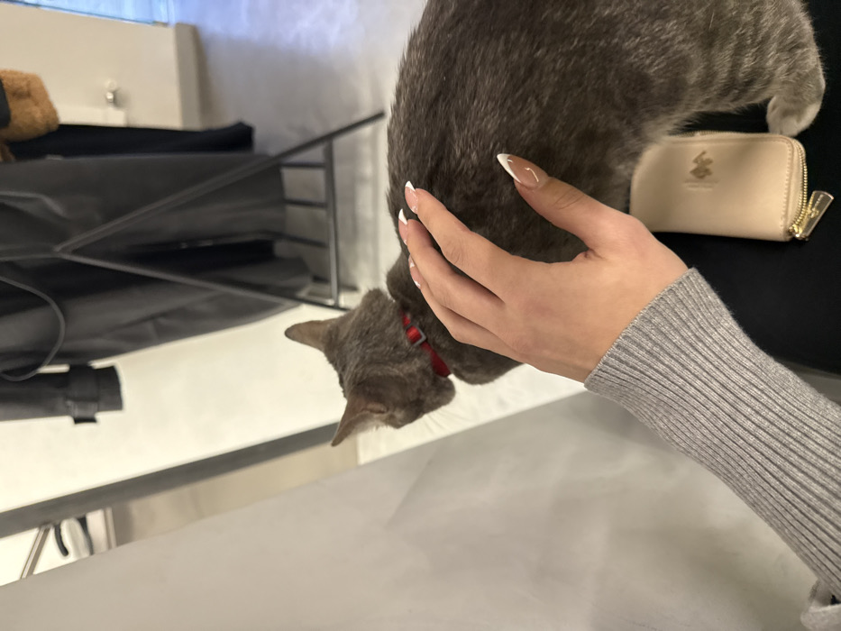 A person's right hand is depicted petting a grey, short-haired cat wearing a red collar. The cat's head is turned away, facing the upper right of the frame, displaying its back and a portion of its side with subtle stripe patterns. The hand, with light skin tone and manicured nails featuring white French tips, rests gently on the cat's mid-back. The person's forearm is covered by a light grey ribbed long-sleeved garment. A small, light beige zippered pouch with a gold zipper is visible beneath the cat, resting on a dark surface, likely the person's lap or clothing. The background features a plain light-colored wall or partition on the left. To the right, a black metal clothing rack holds several dark-colored garments, resembling coats or jackets, and a brown faux fur item. The floor appears to be a light, possibly concrete or tiled surface. The image lacks specific visual identifiers to pinpoint a precise location within Yerevan, Armenia.
