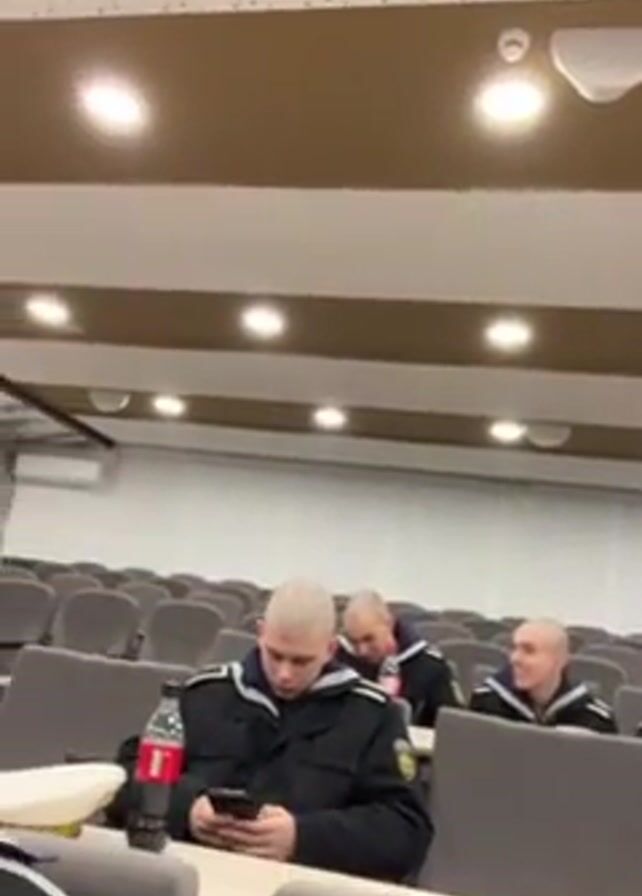 large room filled with rows of grey chairs, each with an attached writing surface. In the chairs, there are several men dressed in dark blue naval uniforms with white trim. Their heads are either shaved or have very short hair. Some of the men are looking at their phones, while others are looking around the room. There are several bottles of Coca-Cola on the writing surfaces. The room has a neutral color scheme with brown and white accents. The ceiling is covered in a pattern of small dots, and there are several recessed lights providing illumination. One man stands up and walks down the aisle.