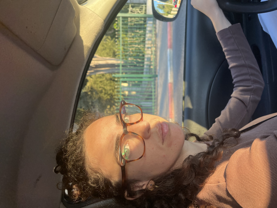 A young adult female is depicted seated in the driver's seat of a vehicle, looking slightly to her left. She has dark, curly hair styled in a bun, and wears brown tortoise-shell eyeglasses. Her complexion is fair with visible minor blemishes on her cheek. She is wearing a light brown long-sleeved top, and a small, light-colored earring is visible on her left ear. Her right hand rests on the steering wheel. Direct sunlight illuminates the left side of her face and hair, creating reflections on her glasses. Through the car's front passenger window, an outdoor scene is visible. A green metal fence runs parallel to the vehicle, behind which green trees and foliage are present. Immediately outside the vehicle, a street curb is painted with distinct red and white stripes, a marking characteristic of a no-parking zone in Israel. The vehicle's passenger side mirror reflects a segment of the street and possibly another vehicle. The scene depicts a sunny daytime environment, consistent with an urban or suburban setting in Haifa, Israel, as indicated by the specific Israeli road markings.