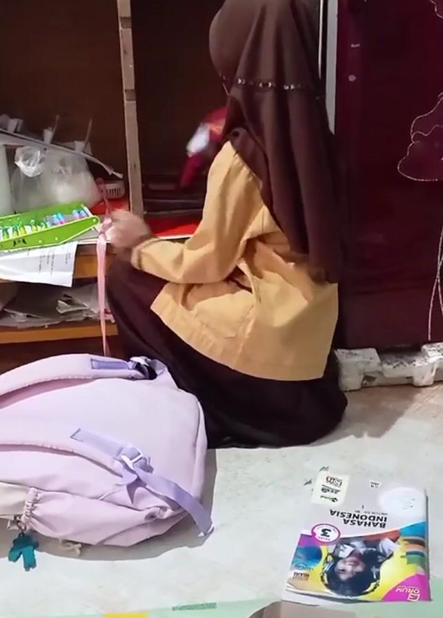 A young person wearing a school uniform and a brown hijab is sitting on the floor in front of a wooden shelf. The person is kneeling with their back to the camera, facing the shelf. They appear to be sorting through papers on the shelf. A light purple backpack is on the floor to the left of the person. A textbook titled “Bahasa Indonesia” is on the floor to the right. The room appears to be indoors and modestly furnished. The lighting is dim.