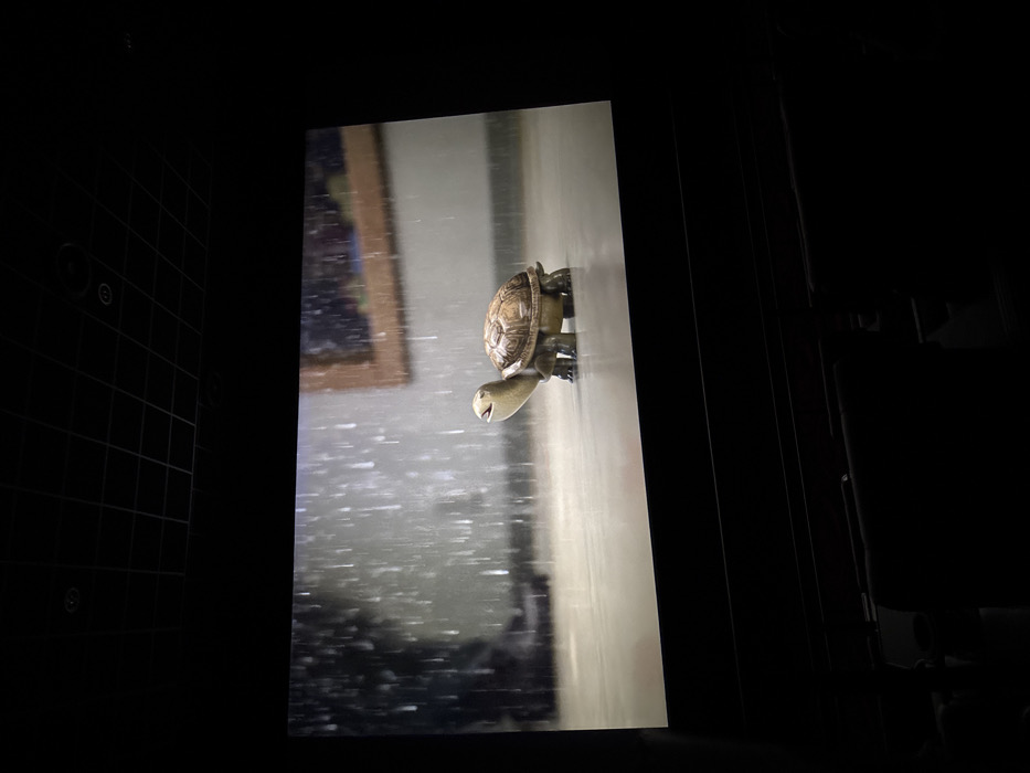 The image depicts the interior of a cinema auditorium located in Sofia, Bulgaria. The perspective is from a low angle within the seating area, showing multiple rows of dark, unoccupied cinema seats in the foreground, leading towards a large, illuminated projection screen. The auditorium's ceiling, a black grid with integrated circular light fixtures, is partially visible above the screen. The screen displays an animated scene featuring a stylized brown turtle standing on a light-colored surface. The turtle has its head raised and mouth slightly open, appearing to observe the heavy rainfall depicted by numerous vertical white streaks across the scene. To the right of the turtle, within the animated background, a blurred brown-framed object is visible against a lighter wall. No individuals are depicted in the visible parts of the auditorium.