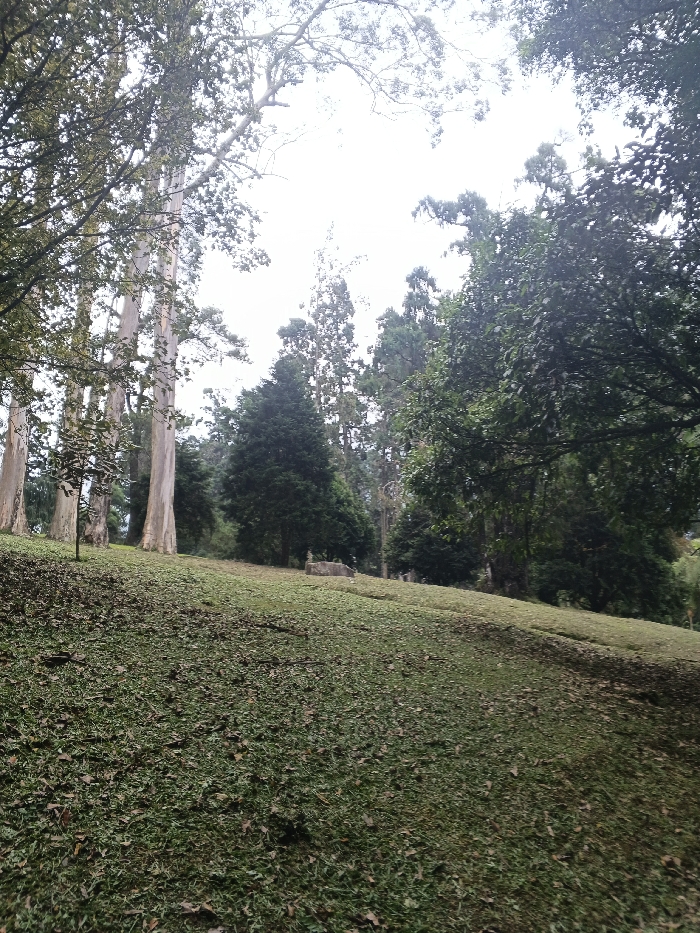This image depicts a sloped, vegetated landscape within the Godawari Botanical Garden in Lalitpur, Nepal. The foreground features an upward-sloping grassy area densely covered with scattered brown leaf litter. This incline continues into the midground, leading to a concentration of trees. A small, light-colored, irregularly shaped stone or concrete object is positioned on the upper part of the slope, slightly right of the frame's vertical center. The background is composed of numerous tall trees, including several with distinct pale, smooth trunks on the left side, and a variety of other species displaying dark green foliage across the rest of the frame. The sky, visible through the tree canopy, is overcast and brightly lit. No human subjects or animals are present.