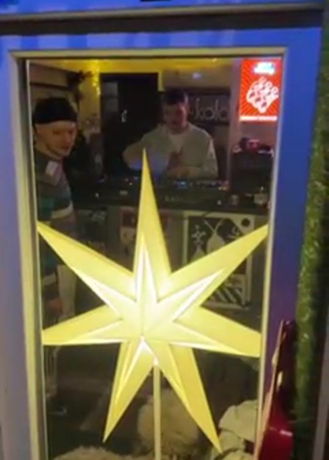 A man wearing a gray jacket over a white t-shirt is working a DJ mixer, as seen through a window. In the foreground is a lit up white star decoration. Another man wearing a striped shirt is standing next to the window, looking at the DJ. A sign for “kola” is on the wall behind the DJ. There are also posters on the wall behind the DJ.