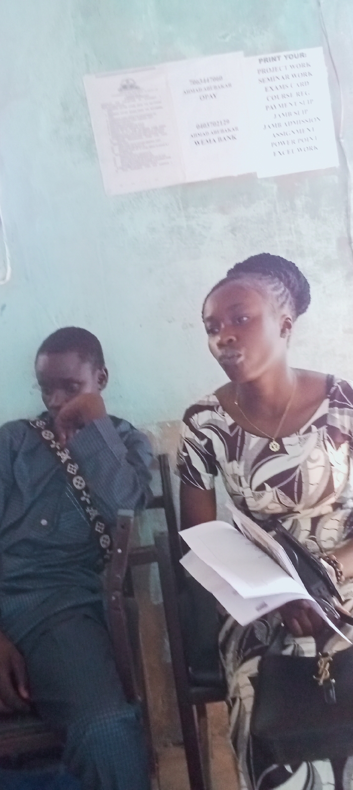 The image depicts an indoor scene in Kabala, Nigeria, specifically an academic support center or printing shop