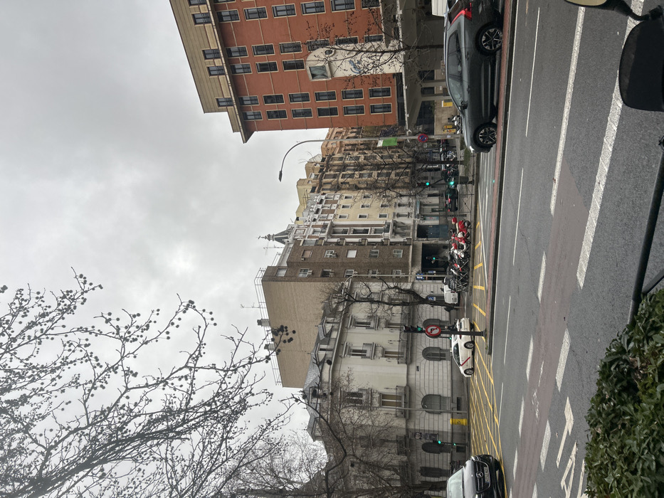 This image depicts a bustling street scene in Madrid, Spain, specifically looking southeast down Calle de San Bernardo towards Plaza de España. The weather is overcast, with a uniform grey sky. In the foreground, the paved street features multiple lanes of traffic, including a dedicated red-marked lane. White dashed lines segment the lanes, and a yellow crisscross pattern marks a box junction in the center. Low green foliage of bushes is visible at the bottom edge. A black motorcycle mirror is partially visible on the bottom right. Several vehicles are present: a dark grey Volvo SUV occupies the right lane, heading right. A white Madrid taxi with a red stripe is in the left lane, also facing right, partially obscured. A black Mercedes car is partially visible on the far left. On the sidewalk to the right, a line of parked scooters and motorcycles, including red and white models, are visible. Multiple green traffic lights are active, and a red circular no-left-turn sign is positioned on a pole in the street's median. Along the sidewalks, bare tree branches, some adorned with small seed pods, frame the upper left portion of the image, indicative of winter or early spring. A single pedestrian figure is distantly visible on the right-side sidewalk near the parked scooters. The background is dominated by a diverse array of multi-story urban buildings. On the far left stands a large, light-colored classical building featuring ornate architectural details, multiple balconies, and dormer windows. Moving right, a series of multi-story residential or commercial buildings display varying architectural styles, including a prominent brown-brick building and others with decorative facades. A small dome or spire crowns one of these central buildings. The far right is anchored by a tall, modern reddish-orange building with numerous dark-framed windows and a distinct golden-yellow upper section. Below this section, a large white structure features a round clock face and a blue logo, identifiable as part of the Hotel Riu Plaza España.