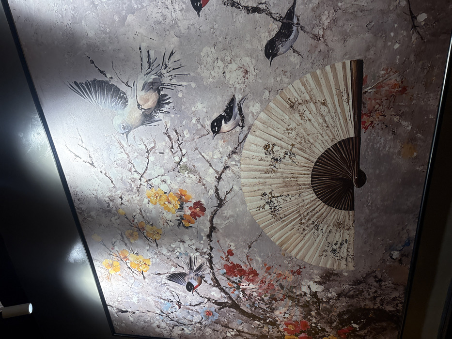 A framed painting depicts a scene with birds, a folding fan, and flowering branches against a mottled gray background