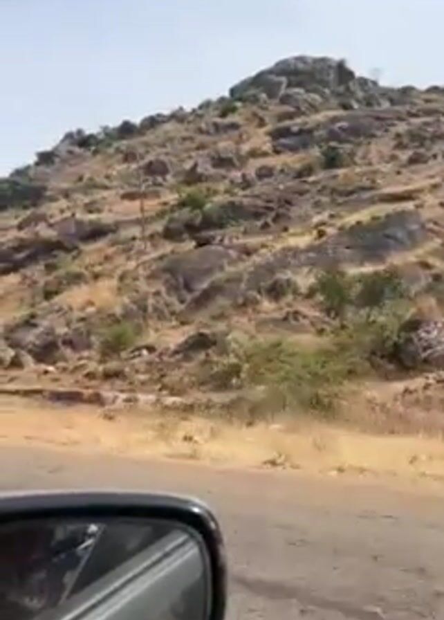 landscape scene viewed from a vehicle moving on a paved road. The focus is on a rocky, arid hillside to the right of the road. The hillside is sparsely vegetated with dry grass and scattered green bushes. Numerous large, gray-brown rocks are spread across the slope. The sky is a light gray-blue. The vehicle's side mirror is visible in the lower left corner of the frame.