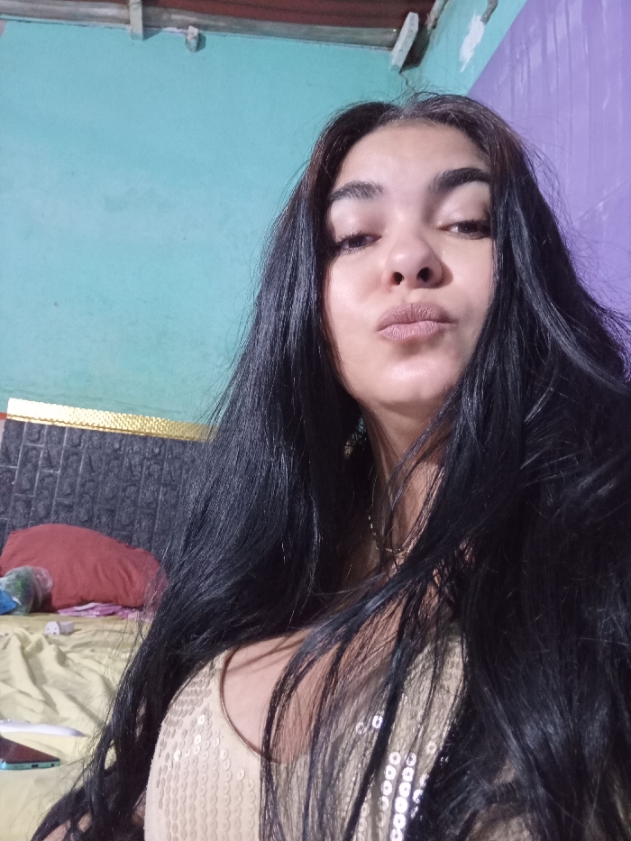 A young woman with long, dark hair poses with pursed lips. She's wearing a tan sequined top. The background consists of a bed with a red pillow and a headboard covered in a dark textured material. Walls behind the bed are painted in two different colors, one teal and one lavender.