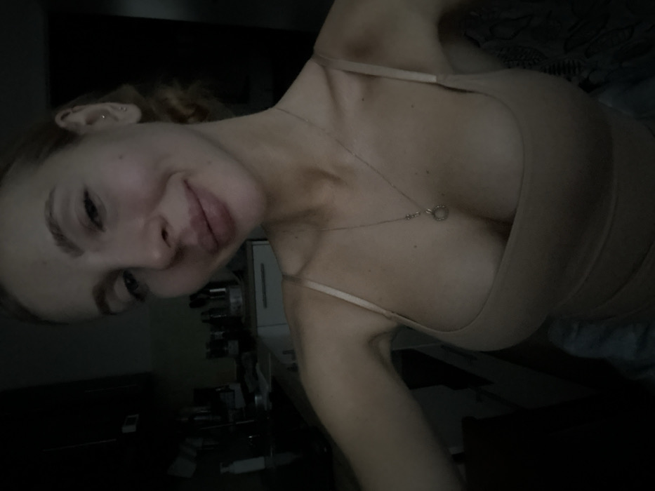 The image, taken in Vsevolozhsk, Russia, depicts a fair-skinned female individual capturing a selfie indoors. She is positioned centrally, facing the camera with a slight smile. Her light-colored hair is pulled back, and she exhibits minimal visible makeup. Ear piercings are discernible on her left ear. She wears a form-fitting, light beige or nude-colored camisole with thin shoulder straps, exposing a significant portion of her upper chest. A thin necklace with a circular pendant rests against her sternum. The background is dimly lit, revealing elements of a domestic interior, possibly a kitchen. Visible details include dark cabinetry on the left, a light-colored countertop with various bottles, one appearing to be a white pump dispenser, and a white drawer unit further right. A patterned fabric, possibly upholstery or bedding, is partially visible in the lower right. The scene suggests a casual, personal setting.