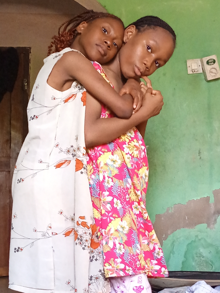 The image captures two young females embracing within an indoor setting in Zango-ndaji, Nigeria