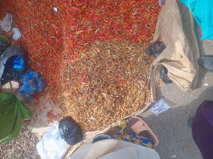 The image captures an outdoor market scene in Kawo, Nigeria, primarily focusing on produce sales at ground level