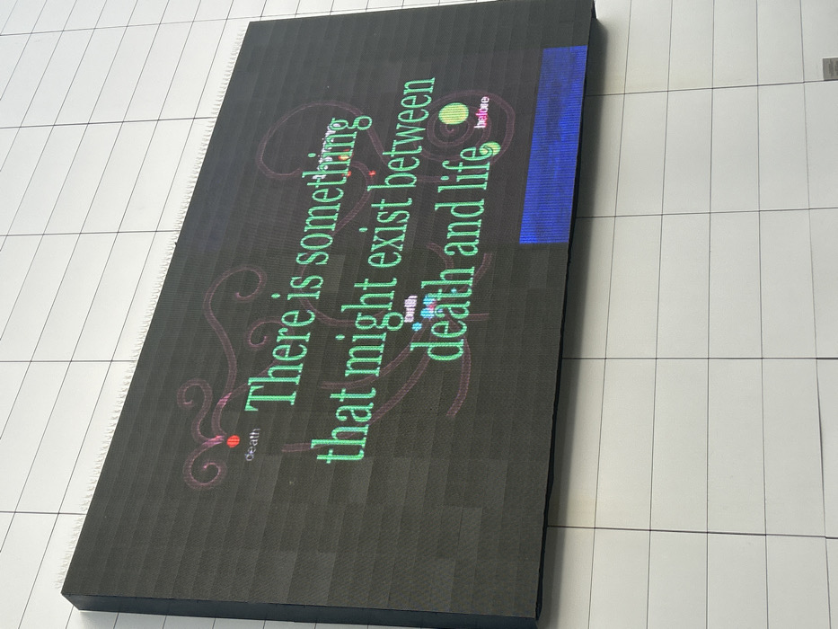 A large rectangular LED digital display, identified as "A False Weight" by Olafur Eliasson, is mounted on the exterior wall of the Vancouver Art Gallery at 750 Hornby Street, Vancouver, Canada. The screen exhibits green serif text stating, "There is something that might exist between death and life." This text is overlaid with swirling pink graphic lines. A small red circular marker with the text "death" below it is situated in the upper left section of the display. The word "truth" in pink is located below the word "something." In the lower right, a small green circular marker is visible with the word "before" printed below it. A solid blue rectangular segment occupies the bottom right corner of the screen. The display is affixed to a building facade constructed of light-colored, rectangular tiled panels with dark grout lines. A row of anti-bird spikes is present along the upper edge of the digital screen and continues upwards along the building wall above it. No individuals, objects, or active interactions are visible in the scene.