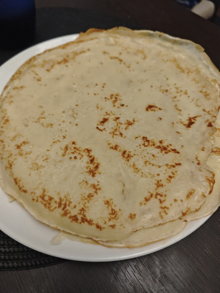 - "A stack of several thin, circular blini, exhibiting a pale cream color with irregular golden-brown cooking marks, rests centered on a round white ceramic plate" by FM-P9SdV2, licensed under CC BY 4.0