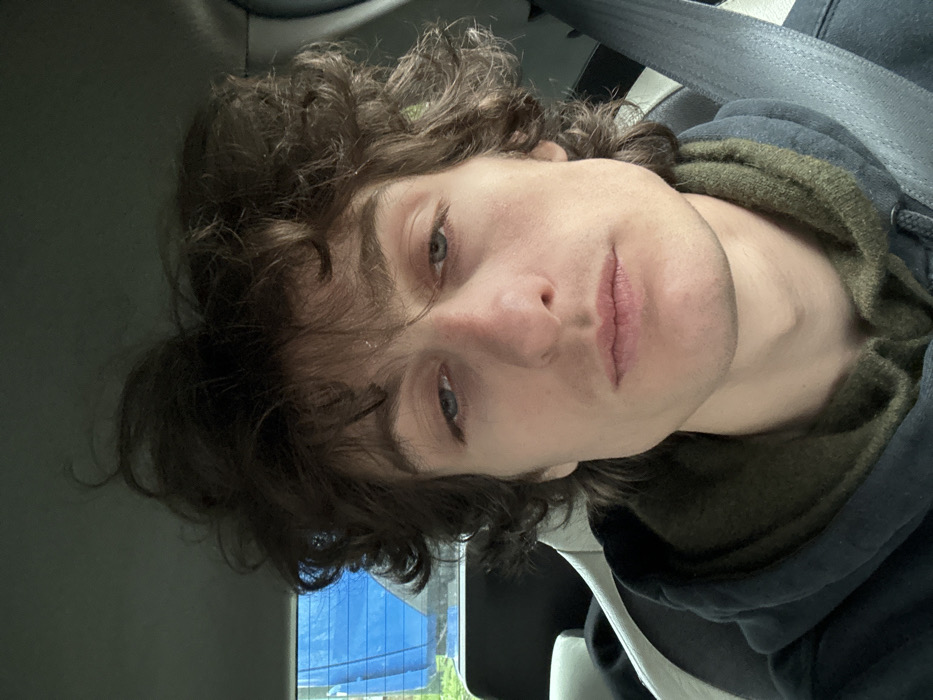 The image displays a single male individual, a young adult, depicted from the chest up within the interior of a vehicle