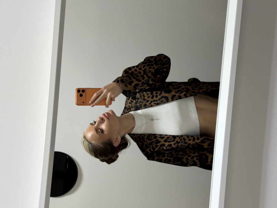 A mirror reflects a woman taking a selfie. She's holding an orange cell phone. She wears a leopard print blazer over a white ribbed top. Her hair is pulled back in a bun. A silver necklace adorns her neck. A black circular object sits to the left of the mirror. The background consists of white walls. The mirror has a white frame.