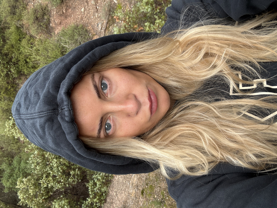 The image displays a close-up selfie of a single female subject located outdoors in Rousset, France. The subject has long, wavy blonde hair, light blue eyes, and fair skin with a tanned complexion. She wears a dark, possibly black or charcoal grey, hooded sweatshirt with the hood pulled up, framing her face. A light-colored graphic or text is partially visible on the lower front of the sweatshirt. Her expression is neutral, with her lips slightly pursed, and she maintains direct eye contact with the camera. The background is an out-of-focus natural environment, characterized by dense green foliage, likely shrubs or bushes, and areas of lighter brown ground cover, indicative of a rural or wooded setting.