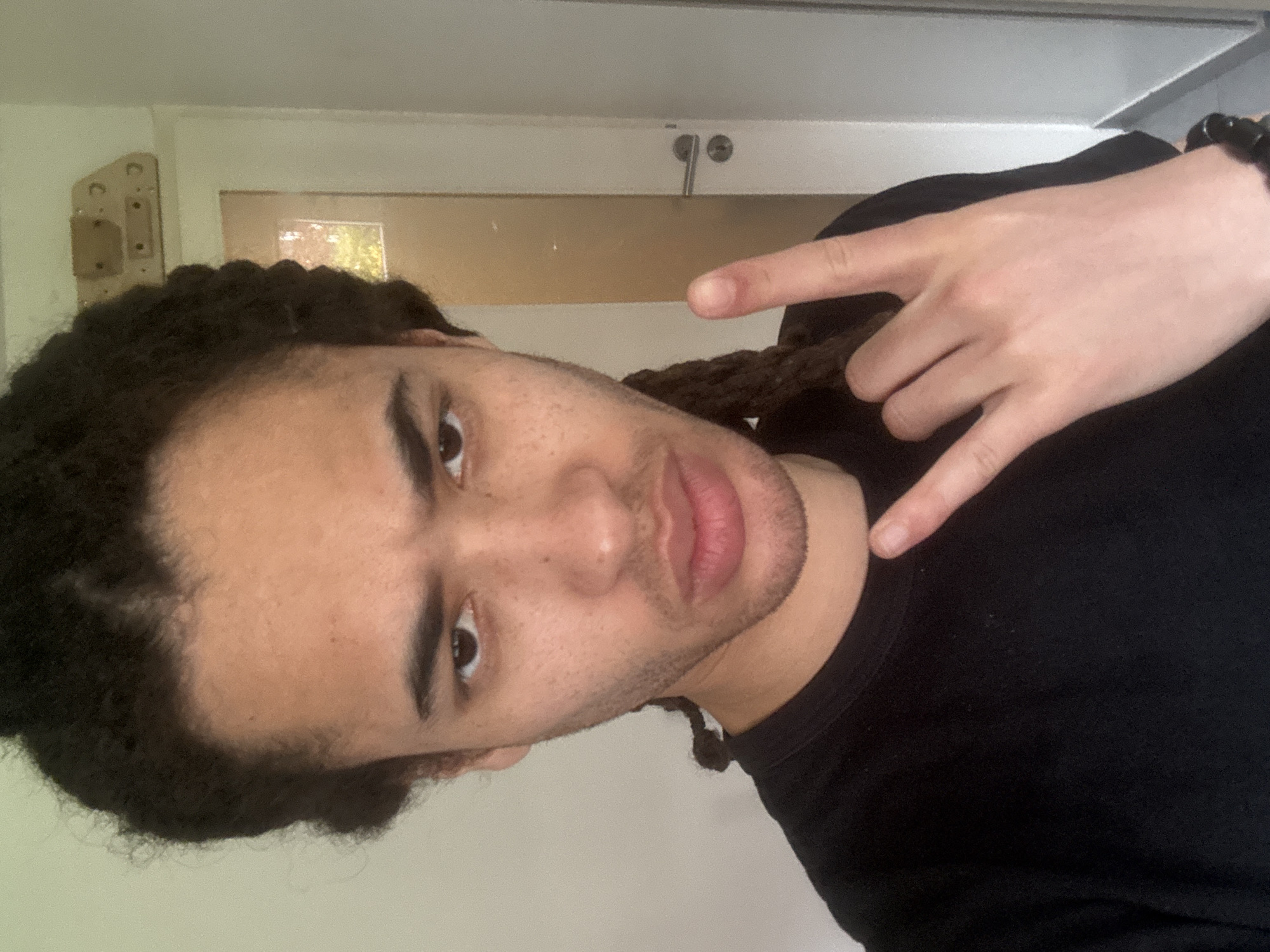 This image displays a male subject in a close-up, chest-up portrait within an indoor environment in Les Ulis, France. The individual has a medium-brown complexion, dark braided hair, and light facial stubble. He wears a black t-shirt and a dark beaded bracelet on his right wrist. His gaze is directed towards the camera, and his lips are slightly parted. The subject's right hand is raised, forming a "sign of the horns" gesture with the index and pinky fingers extended. The background consists of light-colored walls. To the subject's right, a light-colored door with a silver handle and keyhole is visible. A translucent panel in the upper section of the door reveals outdoor greenery. Above the door, a light brown wooden object with multiple grip depressions, consistent with a climbing hangboard, is mounted on the wall.