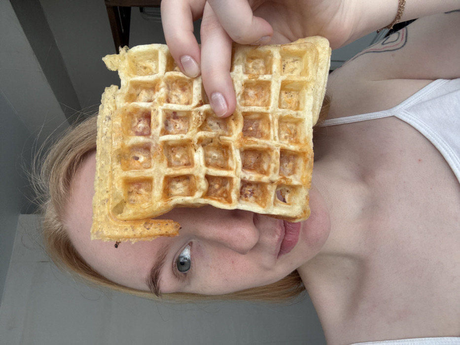 A close-up photograph depicts a young adult female holding a golden-brown waffle, which partially obscures her face