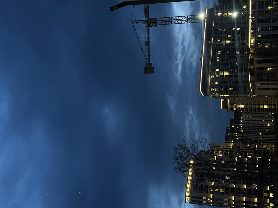 A nighttime scene with tall buildings illuminated with warm lights. A construction crane juts out from behind one of the structures, its silhouette stark against the darkening sky. The sky is filled with streaks of clouds, tinted with hues of blue and grey. Bare tree branches are visible near one of the buildings, adding a touch of nature to the urban landscape.