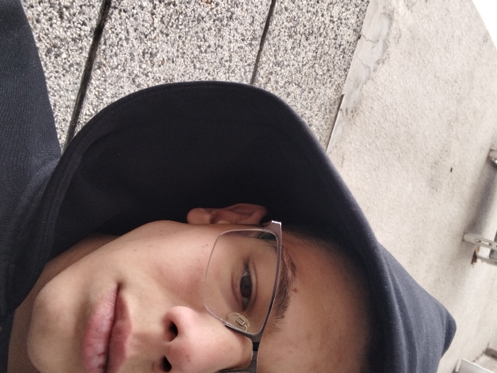 This close-up portrait depicts an individual in the city of Troyan, Bulgaria. The subject, viewed from a slightly low angle, occupies the majority of the frame, facing forward. They are wearing a dark, likely black, hooded garment with the hood pulled up over their head. The right side of their face is prominently visible, showing fair skin, a visible right ear, and distinct eyeglasses with clear or light-colored frames. The right eye is open, behind the lens, and the right eyebrow is well-defined. A small, dark mark is present on the upper right cheek. The background features two distinct ground surfaces: a lighter, cracked concrete surface in the upper left, and a darker, granular texture resembling gravel or asphalt in the lower left, separated by a dark line. A light-colored metallic structure is partially discernible in the upper right quadrant of the background.