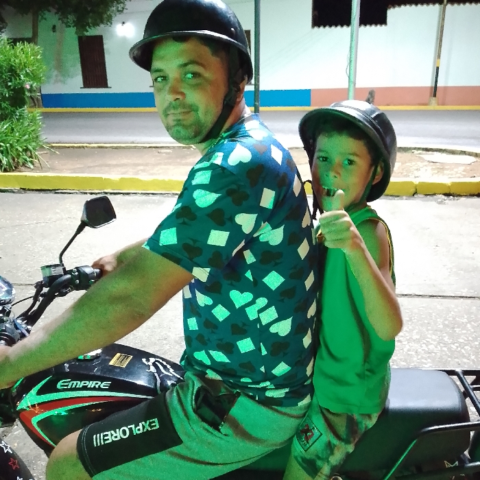 A man and a child are sitting on a motorcycle, both wearing helmets. The man wears a blue T-shirt with playing card suits printed on it and gray shorts. The child, seated behind the man, wears a green tank top and camouflage shorts, giving a thumbs-up. The motorcycle, labeled "EMPIRE," is parked on a street with a sidewalk and buildings in the background. The scene appears to be lit artificially, casting a light glow on the surroundings.