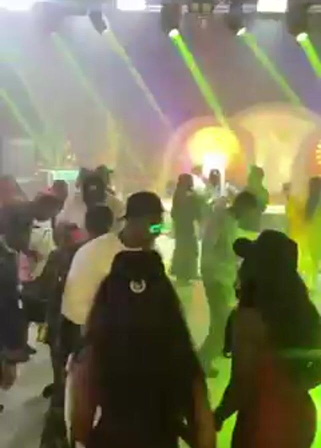 lively dance floor filled with people, mostly dressed in casual to semi-formal attire, moving to music. The lighting is dynamic, shifting between different colors. Behind the crowd is a stage with a simple circular backdrop lit with orange and green hues. Many of the people on the dance floor are recording the event on their phones, while some are dancing with glowing light-up sticks. The atmosphere appears celebratory.