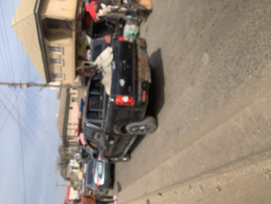 The image depicts a daytime street scene in Jos, Nigeria, characterized by vehicle traffic and roadside activity. A dark-colored pickup truck occupies the central foreground, facing away from the viewer. The vehicle is equipped with a roof rack and features a red and blue light bar across its cab roof. Within the truck's bed, a large, light-colored animal, consistent with a cow or bull, is visible, lying down. The pickup truck's rear bumper appears to be rusty or damaged. To the left of the pickup truck, a light blue sedan is visible in a line of traffic, with additional blurry vehicles extending further down the street. On the far left edge of the frame, a person wearing a brown long-sleeved shirt and pink footwear walks forward on a paved shoulder or sidewalk. To the right of the pickup, obscured details suggest a busy market area, including a partially visible vehicle with an open trunk and several indistinct human figures. In the background, a series of buildings line the street. A prominent two-story building on the right features a light-colored hip roof and multiple windows on its upper floor. Other single-story structures are visible further back. Overhead, utility poles and numerous power lines are present against a light blue, hazy sky. The immediate foreground shows a worn, paved road surface with a raised curb along the left side.