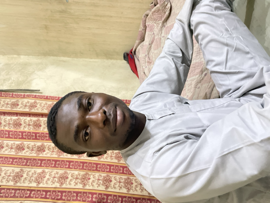 A man is lying on his side on a bed. He wears a light gray outfit. The headboard and wall behind him are patterned. He faces the camera directly with a relaxed expression. The bed is made, and a blanket of mixed patterns can be seen in the background. The overall image is slightly rotated counter-clockwise.