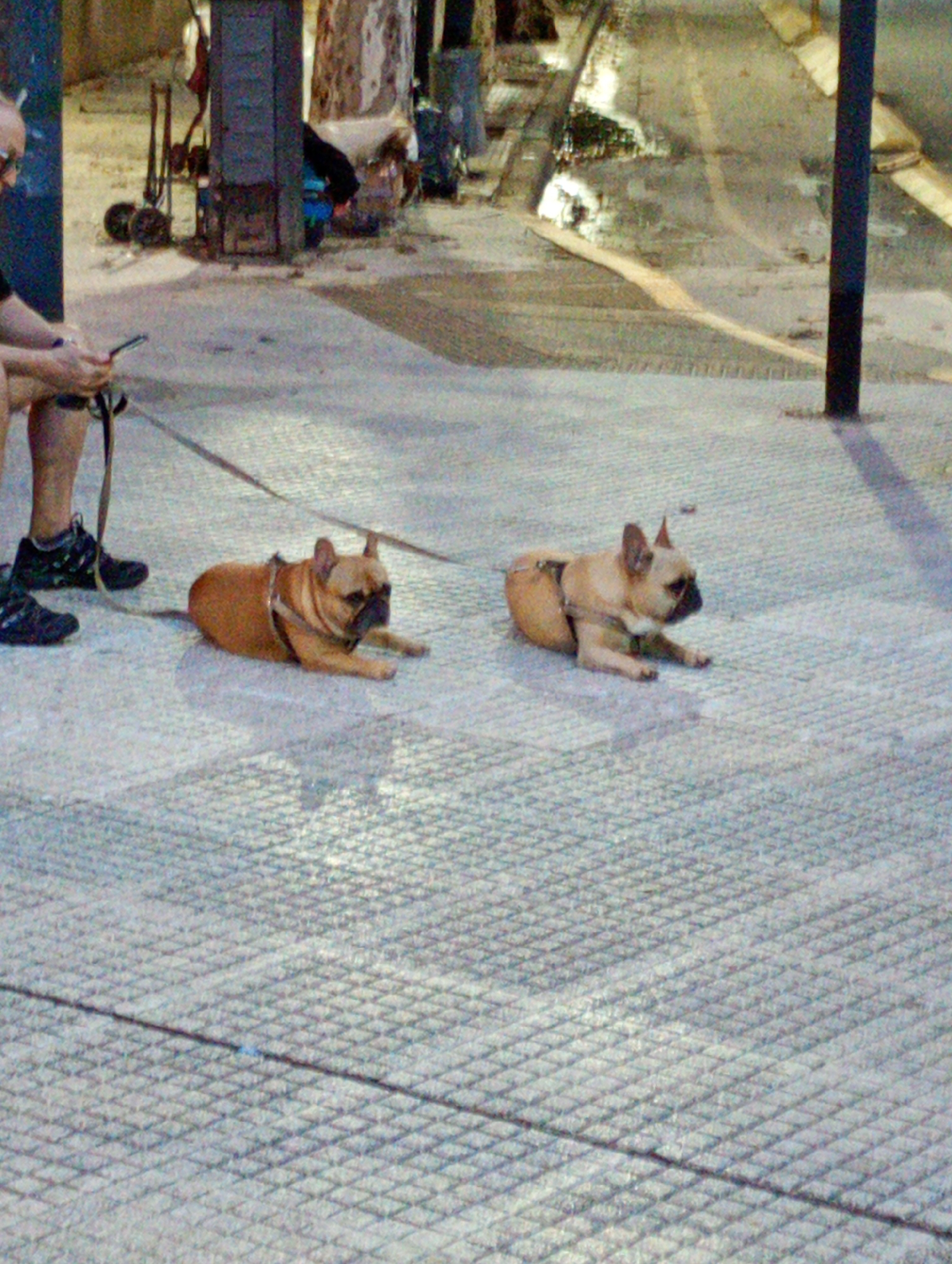 An outdoor scene shows two bulldog-type dogs lying on a concrete sidewalk, both on leashes held by a person sitting nearby. The person is only partially visible, with only the legs and arms holding a smartphone, and wearing shoes, being fully visible. The dogs are tan/fawn in color and appear to be resting. In the background, out of focus, are city objects and a street scene that could be the city of Buenos Aires, Argentina. These may include an older, ornate light post and other street elements like parked vehicles and trees. The background environment suggests it could be evening or night due to the soft lighting. The concrete sidewalk is textured with a diamond pattern, which could indicate some degree of public area in the city.