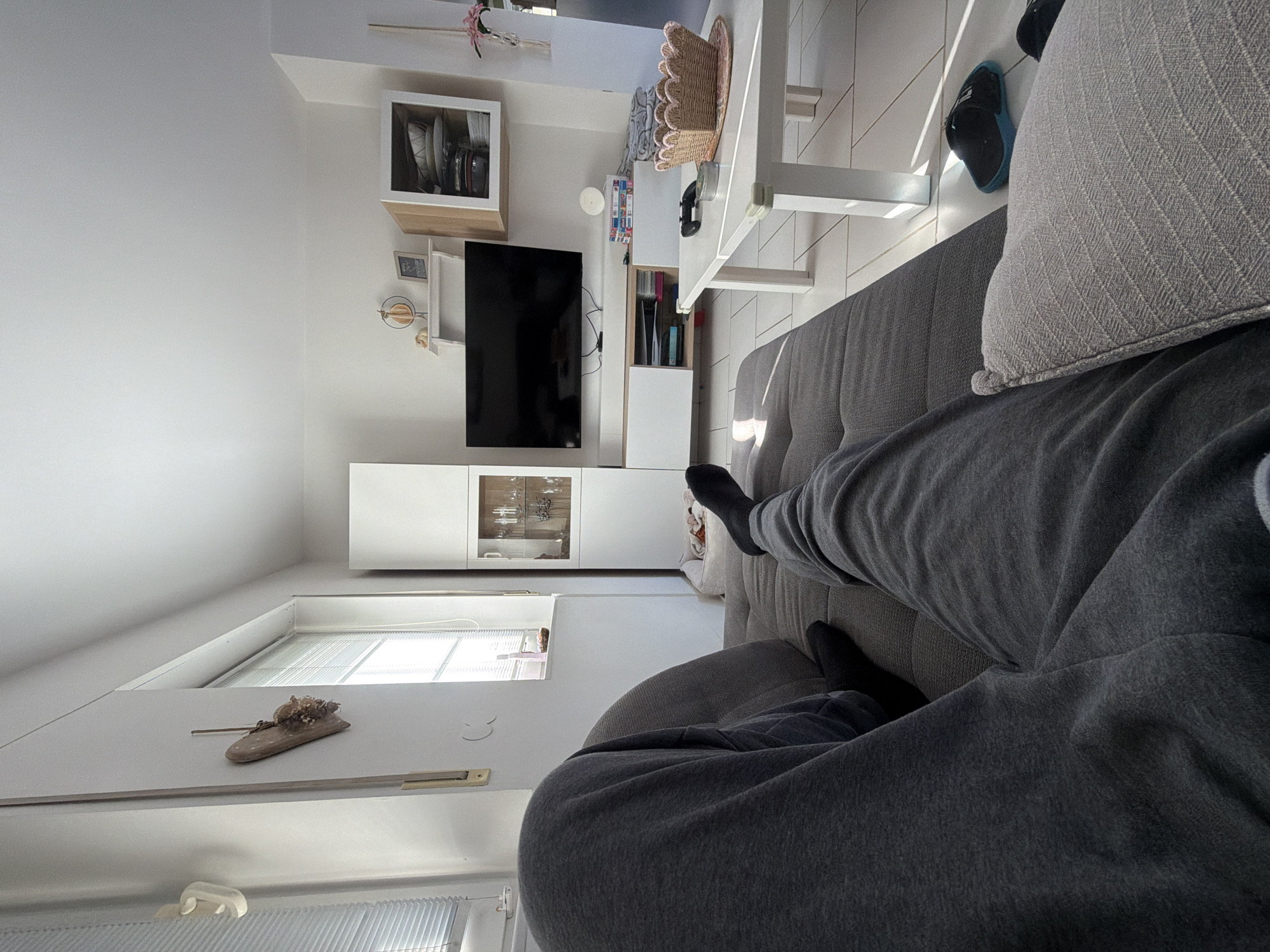 The image captures an indoor living room in Trassem, Germany, from the first-person perspective of an individual reclining on a grey fabric sofa. The individual's legs, clad in dark grey sweatpants and black socks, extend onto the sofa cushions. A white rectangular coffee table, featuring protective corner covers, is positioned directly in front of the sofa. On the coffee table, a black video game controller, a small circular tin, and a pink-edged woven basket resting on a woven mat are present. Beyond the coffee table, a large, black, wall-mounted flat-screen television is centered above a white and light-colored wooden entertainment unit. The entertainment unit houses a white PlayStation 5 console and a stack of colorful media cases. To the left of the television, a tall, narrow white cabinet with a glass front displays glassware. To the right, another similar white cabinet is present, and an open-shelf wooden and white cabinet is mounted above it, containing stacked dishes. A small white floating shelf above the television holds a framed picture and a wooden decorative object. On the left wall, a window fitted with white horizontal blinds allows bright sunlight to stream into the room, illuminating the white tiled floor and creating distinct shadows. A wooden heart-shaped decoration is affixed to the wall adjacent to this window. Near the right side of the frame, a small white pet bed is visible on the floor, and a decorative element featuring pink artificial flowers hangs from the wall. Two black slippers with blue soles are on the floor beside the sofa.