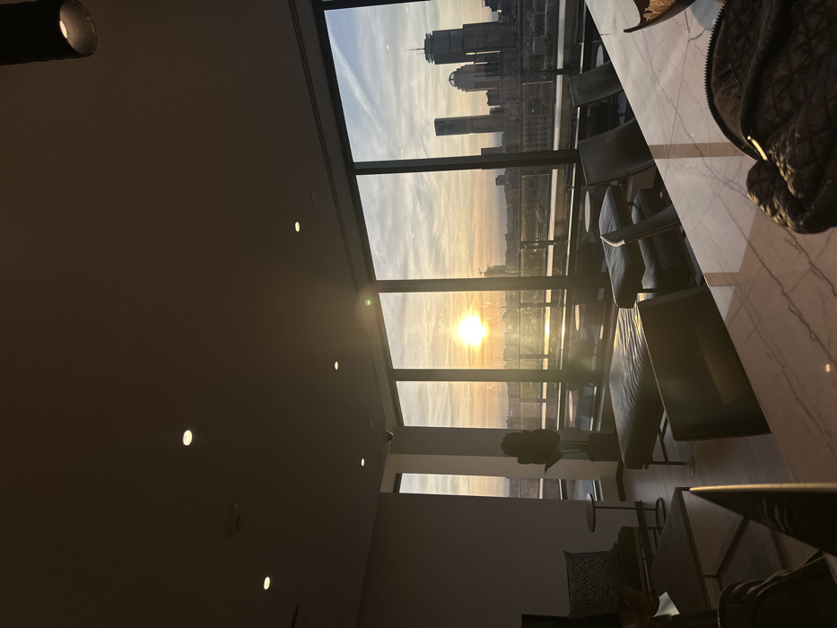The image displays a modern, high-floor interior space, likely a lounge or common area, featuring a panoramic view of the Boston, Massachusetts skyline at sunset. The prominent buildings of the Prudential Tower and the John Hancock Tower (200 Clarendon Street) are distinctly visible on the right side of the distant cityscape, indicating a vantage point generally looking towards the east or southeast. The interior is illuminated by the bright, setting sun, which is centered through the extensive floor-to-ceiling windows, casting a strong golden light. Supplemental illumination comes from multiple recessed ceiling lights that are active, along with a dark, cylindrical hanging light fixture in the upper right. A long, light-colored, reflective counter or bar occupies the foreground on the right, on which a dark, quilted handbag with a visible zipper and a partially obscured light-colored, irregularly shaped bowl are placed. Dark-upholstered chairs are arranged around this counter. In the mid-ground, two dark leather ottomans or low benches are positioned. To the left, an armchair with a patterned pillow and a small, round dark side table are present, along with a tall, dark planter containing a large plant. No individuals are depicted in the scene, and no actions or interactions are occurring. Outside the windows, a flat rooftop or balcony area is visible directly below, featuring several small, circular white tables. The sky displays scattered clouds, with intense orange and yellow hues directly around the setting sun transitioning to lighter blues and grays further away. The distant urban landscape includes numerous buildings, some of which appear to be under construction, and a faint body of water is discernible on the horizon.
