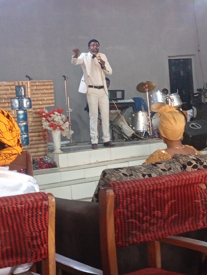 The image depicts an indoor event, likely a religious service, taking place on a raised stage within an event hall or church in Akwanga, Nigeria