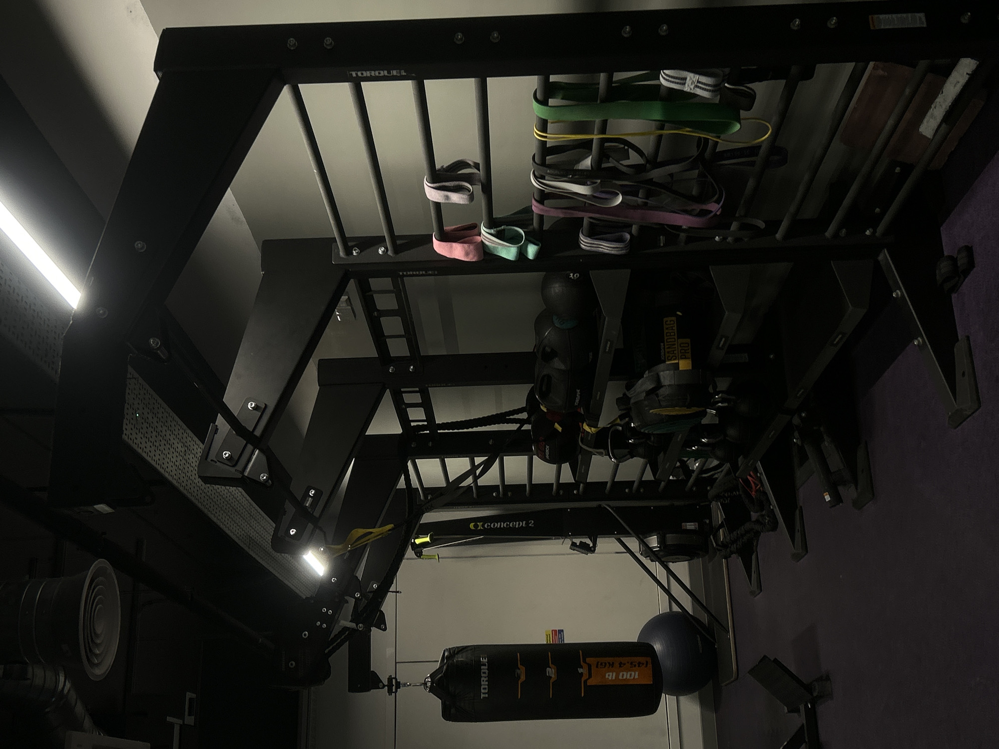 The image depicts an unoccupied indoor gym or fitness area, located within the city of Hertsmere, United Kingdom. The scene is dominated by a large, black, multi-functional fitness rig, identified by "TORQUE" branding, positioned centrally and extending towards the right. Suspended from an arm extending from the left side of the rig is a black punching bag, also branded "TORQUE" and labeled "100 lb (45.4 KG)". A dark blue stability ball rests on the dark purple rubberized floor beneath the punching bag. Adjacent to the punching bag and integrated into the rig structure on the left-mid side is a black Concept2 SkiErg or similar vertical resistance machine, displaying "CConcept 2" branding. The rig features shelving on its mid-right section, holding several black spherical weights, likely medicine balls or slam balls, and a yellow-labeled "SANDBAG PRO". Further to the right, a ladder-like section of the rig serves as storage for numerous resistance bands of various colors, including pink, light purple, teal, dark purple, grey/black striped, yellow, and green, hung over its horizontal bars. Small, bright white LED lights are integrated into the rig's structure, illuminating sections of the equipment. The floor is dark purple rubberized gym matting. The walls are a light, neutral grey. The ceiling is dark and industrial, featuring exposed ventilation ducts (one circular grey duct is visible top-left) and linear overhead LED light fixtures, one of which brightly illuminates the top of the rig. Additional equipment visible on the floor includes black plyometric box components in the left foreground, a coiled thick rope (possibly a battle rope) near the center, and small black straps or bands on the floor in the immediate foreground. Wooden blocks are positioned beneath the base of the rig on the right. No individuals are present in the scene.