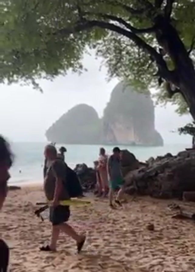 sandy beach with people strolling along the shore and wading in the water. A large, tree provides shade on the right side of the frame. In the distance, several karst islands rise from the water. The sky is overcast, creating soft, diffused lighting across the scene. Some people are taking photos near the water's edge. A man carrying a long, yellow object and wearing a backpack walks across the sand in the foreground.
