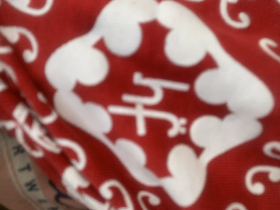 A red fabric patterned with white shapes is folded
