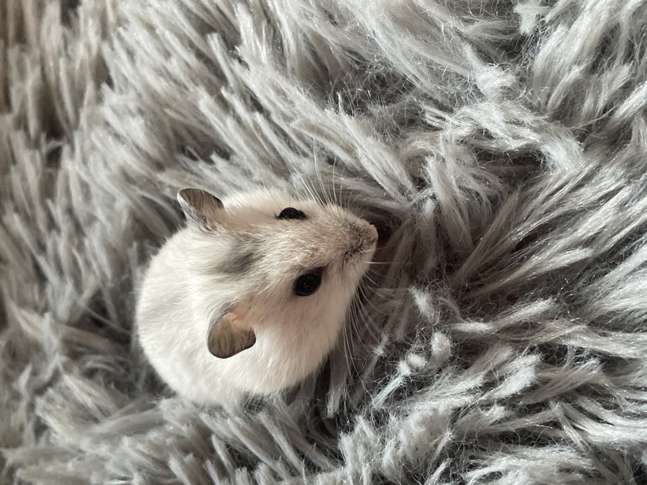 - "At an unspecified indoor location within Novo-Nikolskoye, Russia, a single dwarf hamster is observed positioned centrally on a light grey, shag-pile textile surface, likely a rug or blanket" by FM-vGaxl2, licensed under CC BY 4.0