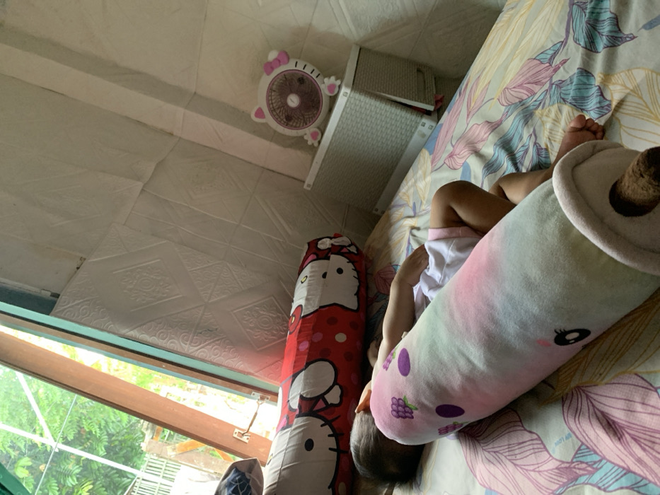 A child sleeps on a bed with floral patterned sheets. They rest against a long, plush pillow shaped like bubble tea, and another pillow featuring Hello Kitty. The room includes a window with a green outdoor view, a white geometric ceiling with patterned panels, and a Hello Kitty fan mounted on the wall. A white basket sits between the fan and the bed.