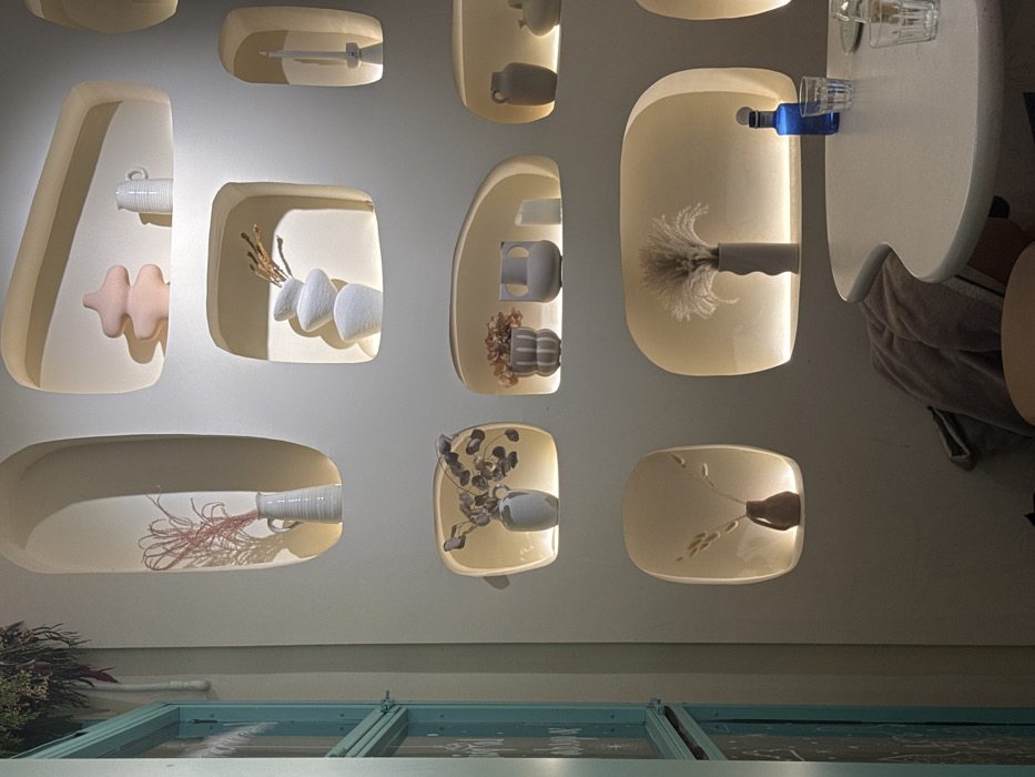 A white wall features numerous illuminated, recessed niches. Each niche contains different decorative items, including vases with dried flowers, unique ceramic objects, and glassware. Light emanates from within the niches, creating a soft, ambient glow. Below, a window frame with a turquoise tint sits, while the edge of a table with glassware and a partial view of a person are visible on the right side.