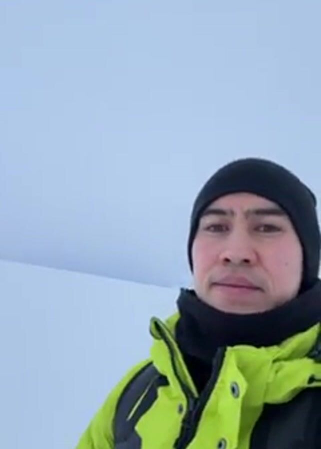 A man in a black beanie and neon green jacket stands in a snowy landscape, looking at the camera. The camera pans to show several people walking in a single-file line across the snow behind him. The background is a vast expanse of snow under a bright, overcast sky, with a visible shoreline in the distance. The group appears to be walking across a frozen body of water. The man in the foreground maintains eye contact with the camera throughout the shot.