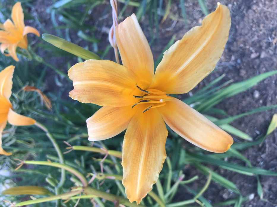 - "The image displays a close-up, eye-level view of a single orange daylily (Hemerocallis) flower, located in a garden setting within Midrand, South Africa" by FM-4m08G2, licensed under CC BY 4.0