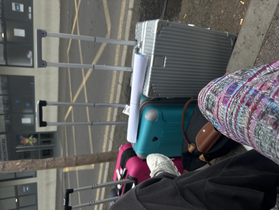 four suitcases lined up outside a building. The building is a light gray color with large windows. The suitcases are all different colors and sizes. The suitcase on the far left is pink, the one in the middle is teal, and the one on the right is silver. The fourth suitcase is hidden behind the others. The suitcases are all in a row on the ground, in front of a brick walkway and a parking lot. The ground is covered in small stones. The person taking the photo is sitting on the ground, their pants are a plaid pattern. The coordinates 28.069, -16.705 correspond to a location near the Puerto de la Cruz, a town on the northern coast of Tenerife in the Canary Islands, Spain. However, the building in the picture does not appear to be in Puerto de la Cruz. The building is likely located elsewhere in the Canary Islands.