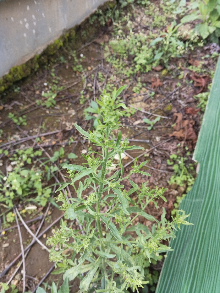 A green plant with budding flowers stands in a garden bed. The surrounding soil is a mix of dirt, small green weeds, and scattered twigs. A concrete wall with moss growth sits on the left, while a green corrugated panel borders the right. The main plant's stem is central, with leaves emerging along its length and clusters of small flower buds at the leaf nodes.