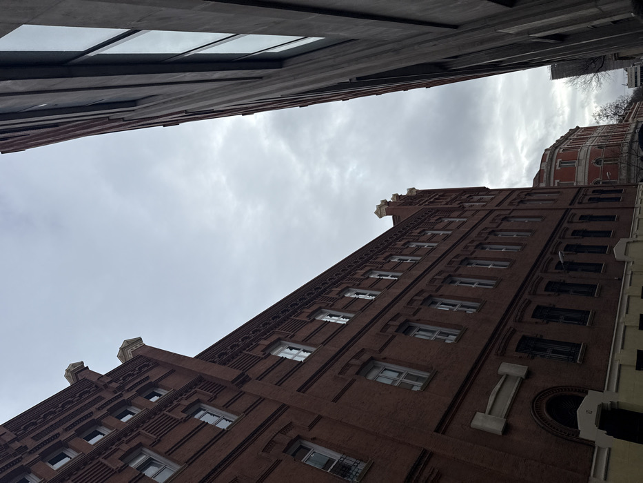 The image depicts an urban street scene in Madrid, Spain, specifically at Calle de Dr. Cortezo, 12, featuring the Real Conservatorio Superior de Música de Madrid. To the left, a multi-story building constructed of dark red brick dominates the frame, extending from the lower left to the upper center. This building features numerous regularly spaced rectangular windows with white frames, many appearing partially open or having shattered panes. Decorative brickwork, including horizontal banding and patterned cornices, is visible between floors and along the roofline, which is capped with two prominent, light-colored pyramidal finials. The building's lower section is characterized by a yellowish-cream painted base, with an arched entrance on the ground floor displaying the street number "12". To the right, a modern, tall building with a grey, possibly concrete or stone, facade and large, reflective glass windows stands sharply angled, extending upwards from the lower right. In the mid-ground, beyond the red brick building, a smaller, curved building with a reddish base and white upper sections is visible. Bare tree branches are partially visible against the sky near this background structure. The sky overhead is uniformly overcast, filled with grey clouds, indicating a dull or wintery day. No individuals, vehicles, or active street-level interactions are visible in the frame.
