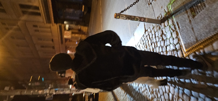 A person wearing dark clothing and a beanie stands on a cobblestone street at night. A short metal post with stickers is to the right. A building is visible across the street in the background, illuminated by warm light. The image is taken from a low angle and is rotated.