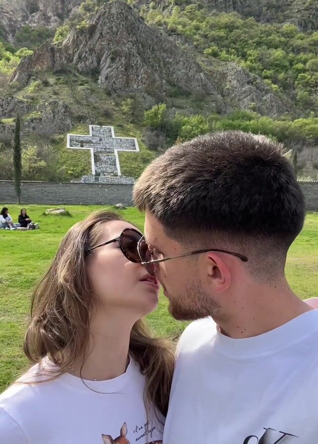 A young couple in matching white t-shirts and sunglasses stands in front of a grassy field. Behind them is a hill with a large stone cross. The woman has long brown hair and her t-shirt features a deer illustration. The man has short dark hair and a beard, his shirt has a CK logo. The couple looks at each other and then kisses. Other people can be seen sitting in the background.