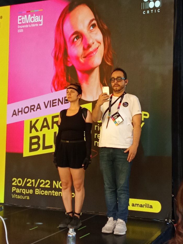 Two individuals stand before a stage backdrop for the event "EtMday," promoting mental entrepreneurship, alongside "CRTIC". The backdrop includes a woman's face and text announcing "KAR BL" and event dates at "Parque Bicentenario, Vitacura." A woman in black attire stands on what appears to be a bottle or cylinder, adorned with a headband. Next to her, a man in a white t-shirt and jeans uses his phone, sporting a lanyard and glasses. The scene is brightly lit, emphasizing the stage presentation.