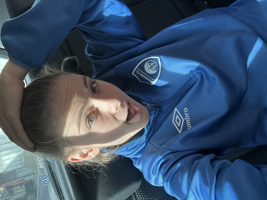 A person with fair skin and light hair, wearing a blue athletic jacket, poses in what appears to be a car. The jacket has logos for "FREEDOM F.C." and "Umbro". The person's mouth is open in a surprised or excited expression, and one hand is on their head. Part of the vehicle's window and door frame is visible, along with the shadow of the person. The overall lighting suggests a sunny day.