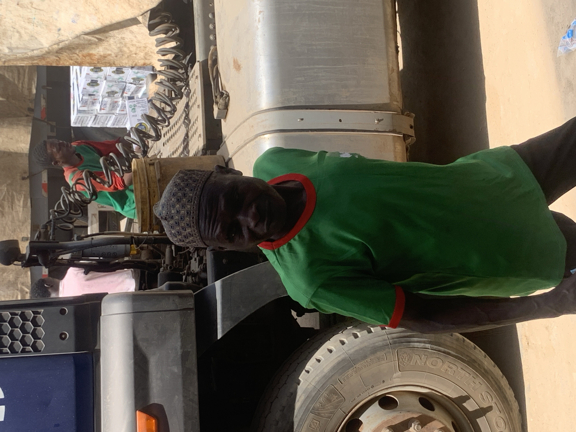 The image depicts an outdoor scene in Fagge C, Nigeria, under bright daylight. In the immediate foreground, an adult male with a dark complexion, wearing a green short-sleeved t-shirt with a red collar and a patterned dark cap, stands facing the viewer with a neutral expression. His left arm is visible. Behind him, occupying the left side of the frame, is the front left section of a dark blue heavy-duty truck, including a tire branded "NORTH." Further into the scene, on the bed or chassis of the truck, two other males are visible. One male, wearing a red and green long-sleeved shirt, is positioned towards the center-right, looking downwards near stacked white boxes, which appear to be cargo. Coiled air hoses are visible in front of him on the truck platform. Another male, seen from behind wearing a light pink t-shirt, is situated further left, behind the truck's cab. The truck's light gray fuel tank or storage compartment is visible to the right of the foreground subject. The ground consists of dry, light-colored dirt, and a small white plastic bag rests near the foreground subject's feet. A light-colored tarp covers part of the background, likely extending over the truck's cargo area or a nearby structure.
