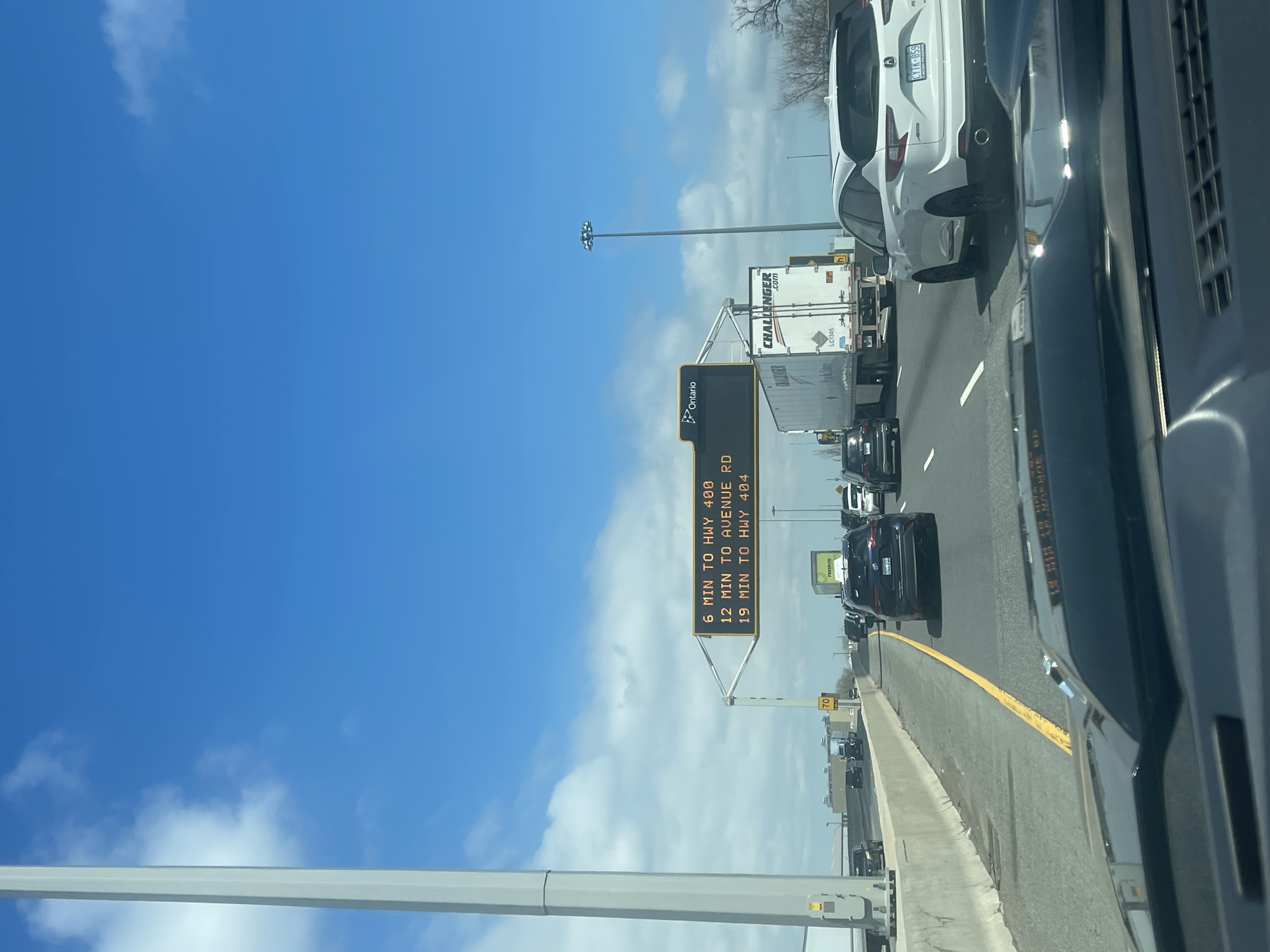 congested highway in Toronto, Canada. Traffic is slow-moving, with multiple cars and trucks visible. An electronic sign displays travel times to various destinations: 6 minutes to Highway 400, 12 minutes to Avenue Road, and 19 minutes to Highway 404. The weather is clear with a blue sky. The sign also displays the Ontario logo. Other signs for FRESH CO and Challenger.com are visible. A speed limit sign of 70 is visible.